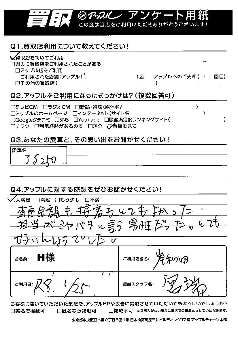 お車のご相談・ 査定だけでもOK! カンタン 入力 30秒 アップルがブランド買取始めました! お電話でも受付中! 受付時間9:00~18:00 0120-48-5210 お車のご相談・ 査定だけでもOK! カンタン 入力 30秒 アップルがブランド買取始めました! お電話でも受付中! 受付時間9:00~18:00 0120-48-5210 アップルがブランド買取始めました! お電話でも受付中! 受付時間9:00~18:00 0120-48-5210 店舗情報 在庫車 スタッフ紹介 ブログ お客様の声 キャンペーン 無料査定 click お客様の声 ご記入日: 2026/01/25 H様 車名:レクサス IS (国内仕様 右H) Q:アップルに対する感想をぜひお聞かせください!大満足査定金額も接客も とてもよかった。担当がミヤバタと言う男性だった。とても好印象でした。 前へ 次へ お客様の声一覧を見る
