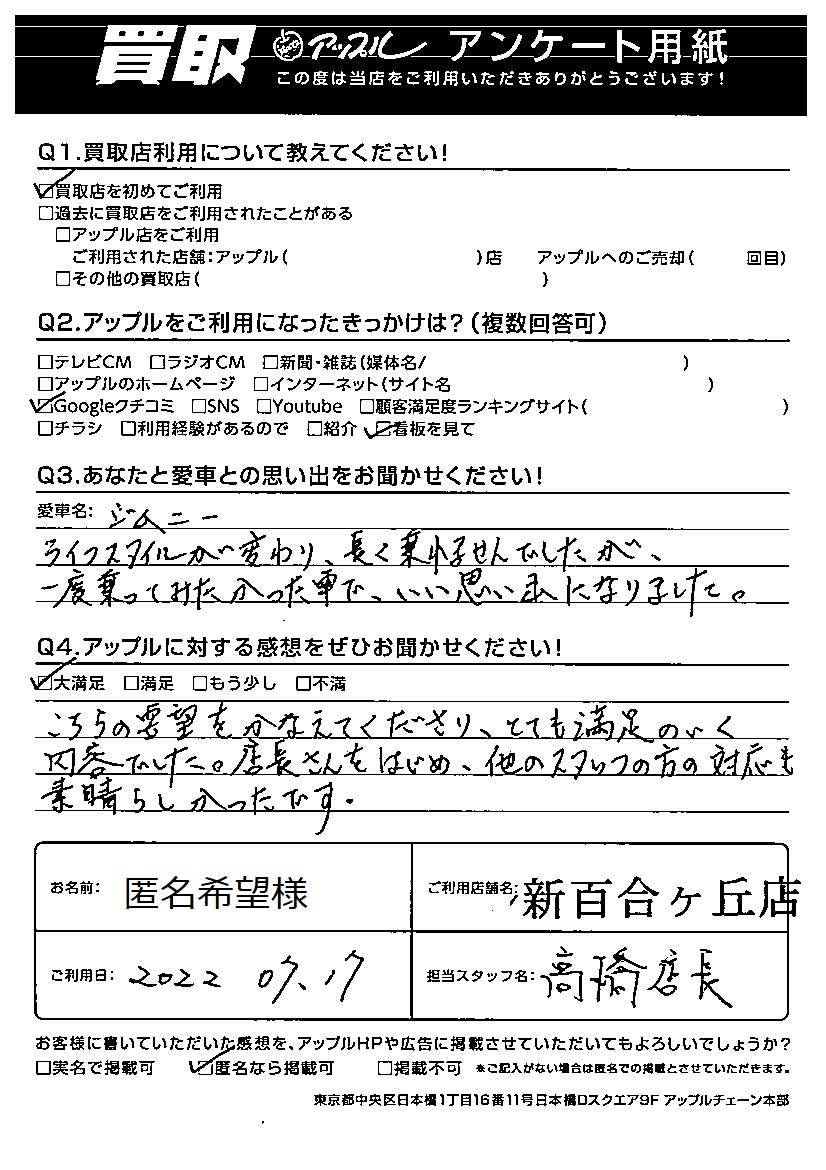 お車のご相談・ 査定だけでもOK! カンタン 入力 30秒 アップルがブランド買取始めました! お電話でも受付中! 受付時間9:00~18:00 044-981-0901 お車のご相談・ 査定だけでもOK! カンタン 入力 30秒 アップルがブランド買取始めました! お電話でも受付中! 受付時間9:00~18:00 044-981-0901 アップルがブランド買取始めました! お電話でも受付中! 受付時間9:00~18:00 044-981-0901 店舗情報 在庫車 スタッフ紹介 ブログ お客様の声 キャンペーン 無料査定 click お客様の声 ご記入日: 2022/07/17 匿名希望様 車名:スズキ ジムニー こちらの要望をかなえてくださり、とても満足のいく内容でした。店長さんをはじめ、他のスタッフの方の対応も素晴らしかったです。 前へ 次へ お客様の声一覧を見る
