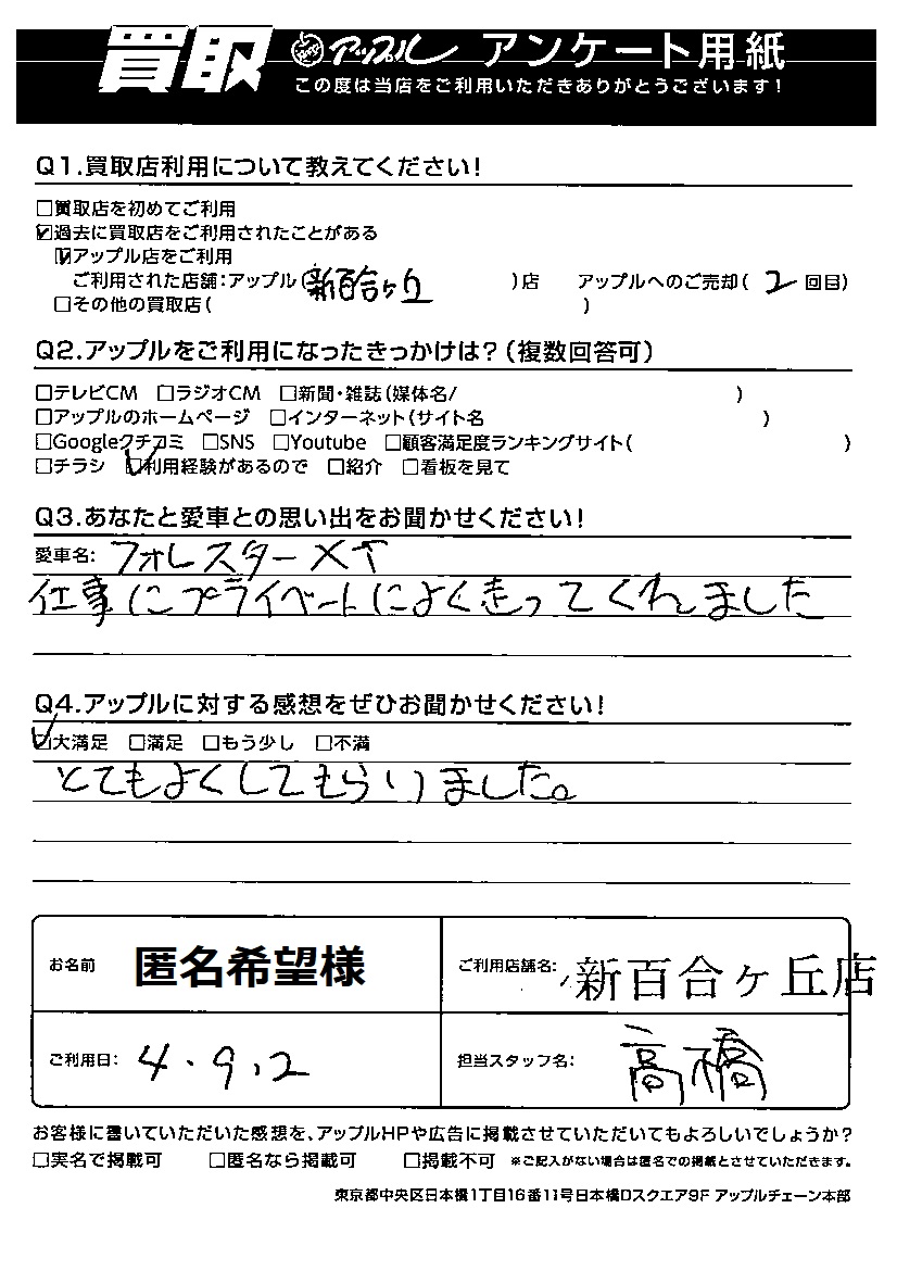 お車のご相談・ 査定だけでもOK! カンタン 入力 30秒 アップルがブランド買取始めました! お電話でも受付中! 受付時間9:00~18:00 044-981-0901 お車のご相談・ 査定だけでもOK! カンタン 入力 30秒 アップルがブランド買取始めました! お電話でも受付中! 受付時間9:00~18:00 044-981-0901 アップルがブランド買取始めました! お電話でも受付中! 受付時間9:00~18:00 044-981-0901 店舗情報 在庫車 スタッフ紹介 ブログ お客様の声 キャンペーン 無料査定 click お客様の声 ご記入日: 2022/09/02 匿名希望様 車名:スバル フォレスター とてもよくしてもらいました。 前へ 次へ お客様の声一覧を見る
