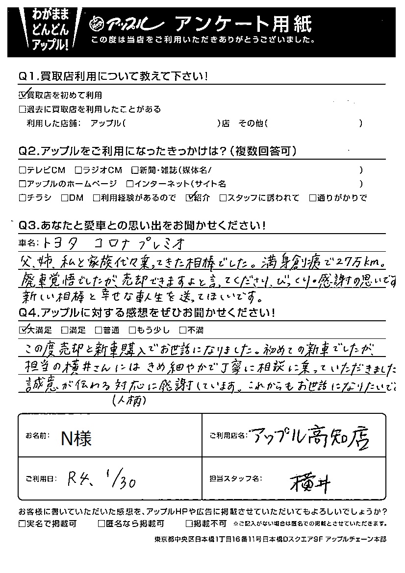 この度売却と新車購入でお世話になりました。初めての新車でしたが
