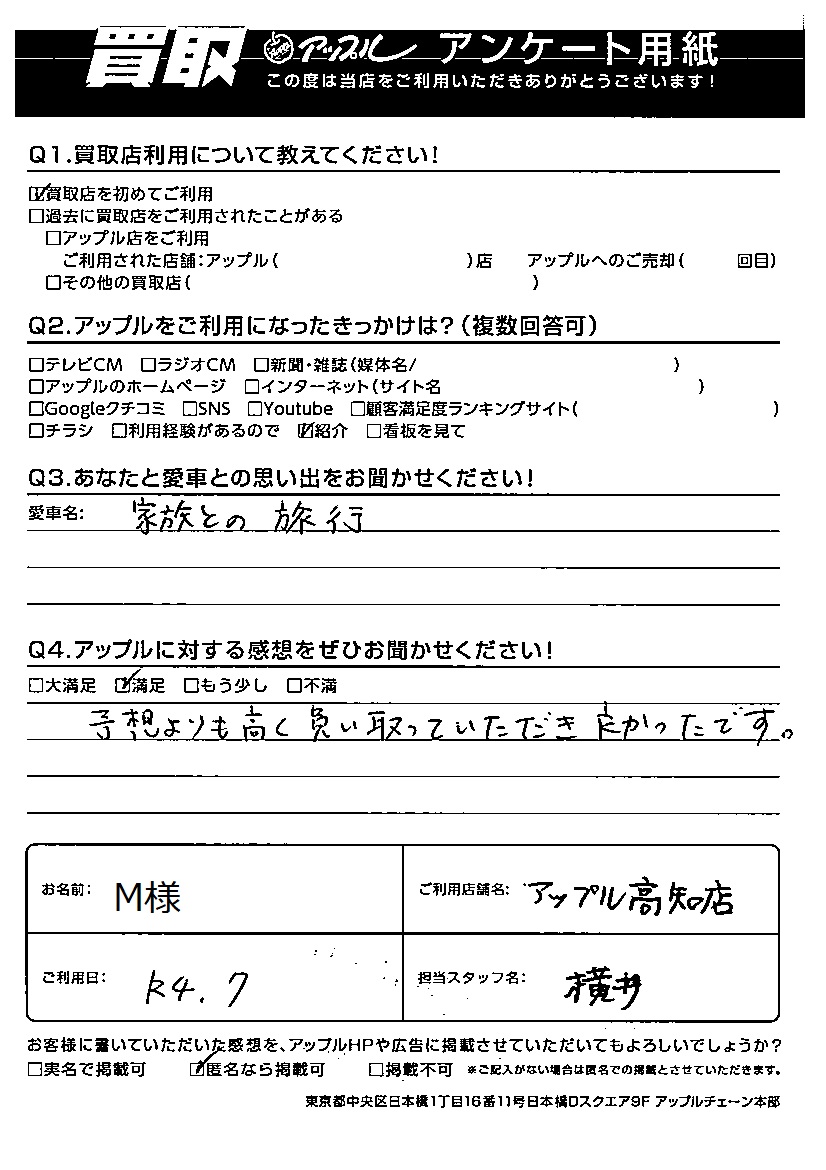 お車のご相談・ 査定だけでもOK! カンタン 入力 30秒 アップルがブランド買取始めました! お電話でも受付中! 受付時間10:00~19:00 ※日曜日は10:00~18:00とさせていただいております。 0120-939352 お車のご相談・ 査定だけでもOK! カンタン 入力 30秒 アップルがブランド買取始めました! お電話でも受付中! 受付時間10:00~19:00 ※日曜日は10:00~18:00とさせていただいております。 0120-939352 アップルがブランド買取始めました! お電話でも受付中! 受付時間10:00~19:00 ※日曜日は10:00~18:00とさせていただいております。 0120-939352 店舗情報 在庫車 スタッフ紹介 ブログ お客様の声 キャンペーン 無料査定 click お客様の声 ご記入日: 2022/07/01 M様 Q あなたと愛車との思い出をお聞かせください!家族との旅行Q アップルに対する感想をぜひお聞かせください!感想:満足予想よりも高く買い取っていただき良かったです。 前へ 次へ お客様の声一覧を見る