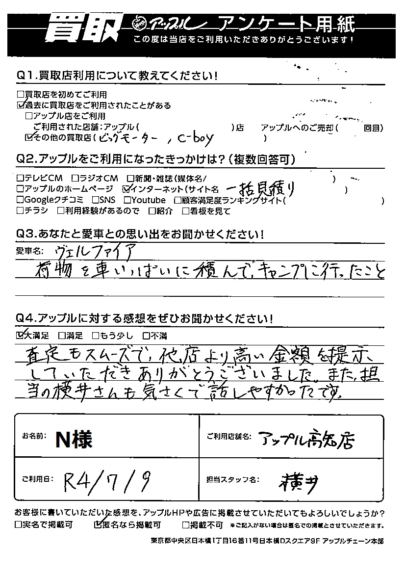 査定もスムーズで、他店より高い金額を提示していただきありがとうございました。
