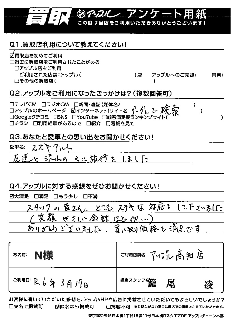 N様 車名:スズキ アルト (2015年12月以降のワークス含む)