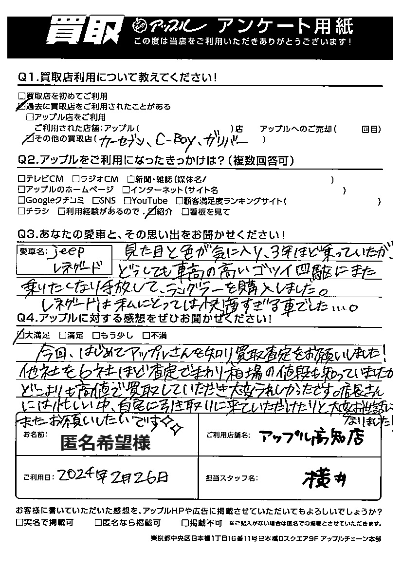 他社を6社ほど査定でまわり相場の値段も知ってましたが、どこよりも高値で買取していただき大変うれしかったです。店長さんには忙しい中、自宅に引き取りに来ていただけたりと大変お世話になりました!