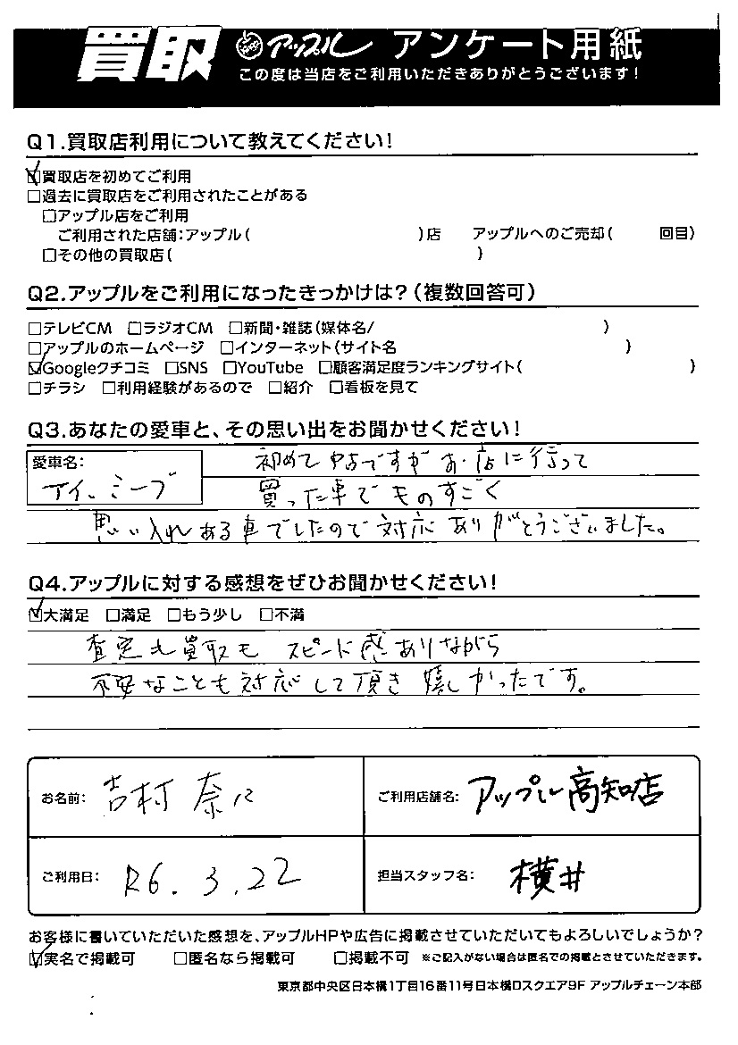 初めて中古ですがお店に行って買った車でものすごく思い入れのある車でしたので対応ありがとうございました。