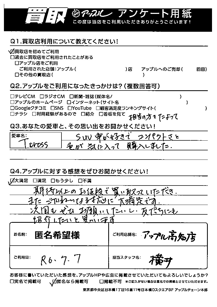 匿名希望様 車名:フォルクスワーゲン T-Cross