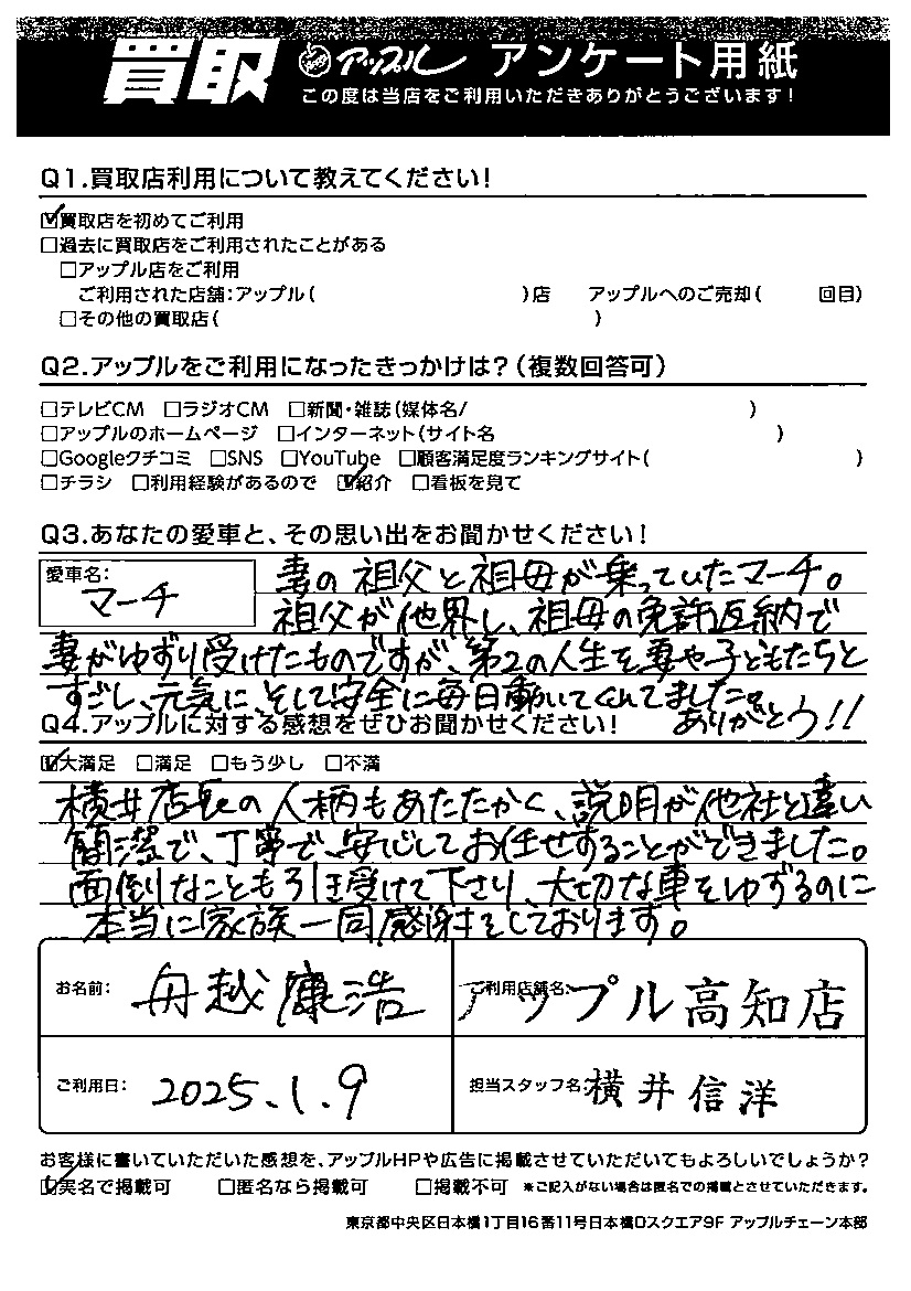 横井店長の人柄もあたたかく、説明が他社と違い簡潔で、丁寧で、安心してお任せすることができました。面倒なところも引き受けて下さり、大切な車をゆずるのに本当に家族一同感謝をしております。
