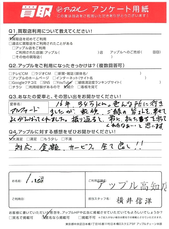 O様 車名:トヨタ アルファード(H27年1月~のHYBRID含む)