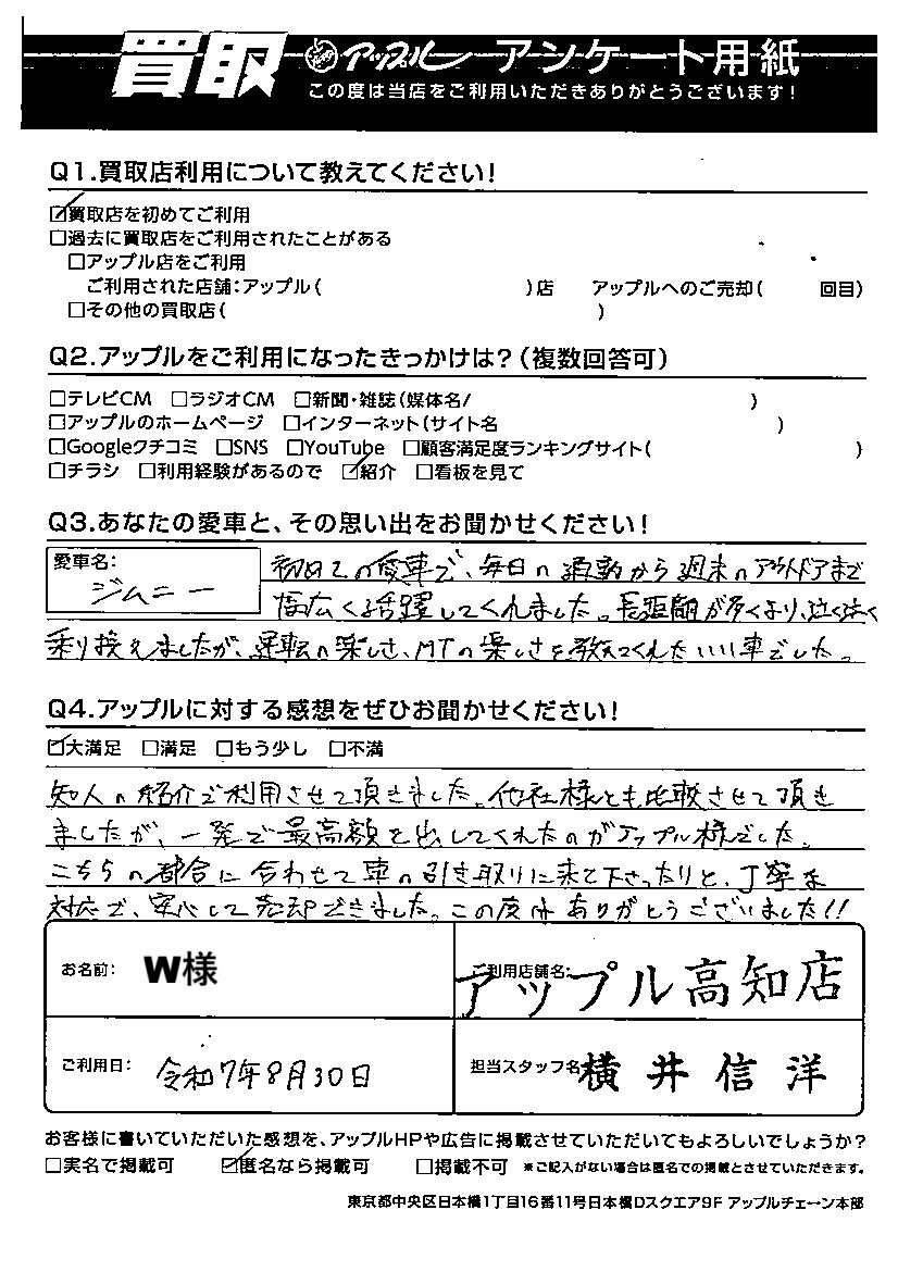 知人の紹介で利用させて頂きました。他社様とも比較させて頂きましたが、一発で最高額を出してくれたのがアップル様でした。こちらの都合に合わせて車の引き取りに来てくださったりと、丁寧な対応で安心して売却できました。この度はありがとうございました!!