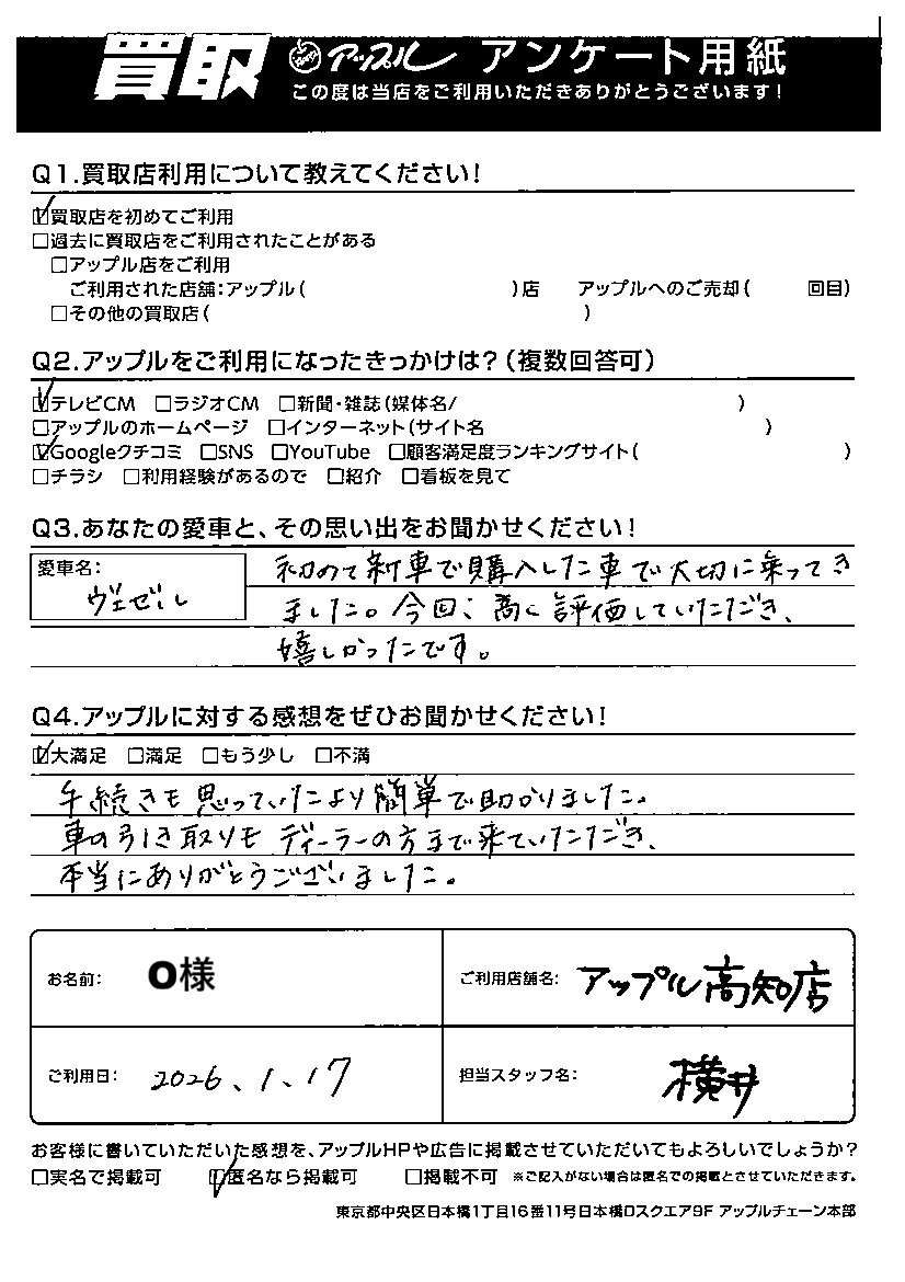 初めて新車で購入した車で大切に乗ってきました。今回、高く評価していただき、嬉しかったです。
