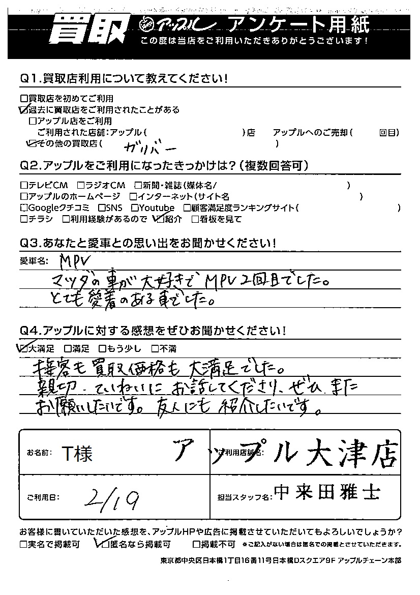 T様 車名:マツダ MPV