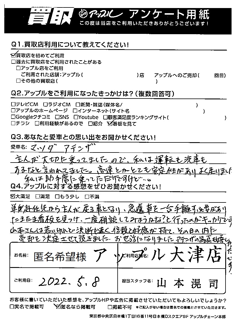 匿名希望様 車名:マツダ アテンザ