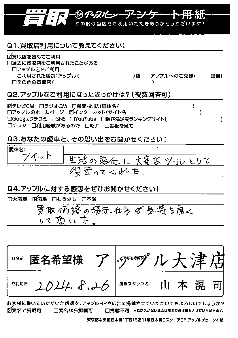 匿名希望様 車名:ホンダ フィット(H25年9月以降のハイブリッド含む)