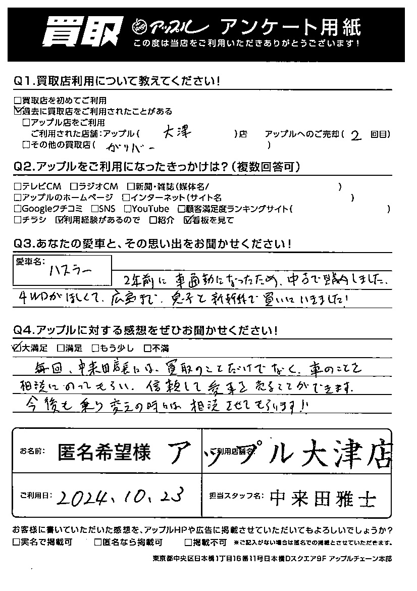毎回、中来田店長には、買取のことだけでなく、車のことを相談にのってもらい、信頼して愛車を売ることができます。