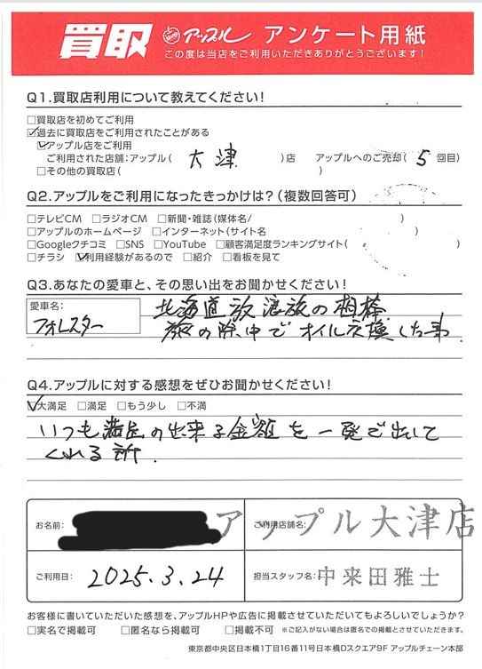 お車のご相談・ 査定だけでもOK! カンタン 入力 30秒 アップルがブランド買取始めました! お電話でも受付中! 受付時間10:00~19:00 077-527-9060 お車のご相談・ 査定だけでもOK! カンタン 入力 30秒 アップルがブランド買取始めました! お電話でも受付中! 受付時間10:00~19:00 077-527-9060 アップルがブランド買取始めました! お電話でも受付中! 受付時間10:00~19:00 077-527-9060 店舗情報 在庫車 スタッフ紹介 ブログ お客様の声 キャンペーン 無料査定 click お客様の声 ご記入日: 2025/03/24 Y様 車名:スバル フォレスター 【あなたと愛車との思い出をお聞かせ下さい!】愛車名:フォレスター【アップルに対する感想をぜひお聞かせ下さい!】大満足!いつも満足の出来る金額を一発で出してくれる所。担当:中来田 前へ 次へ お客様の声一覧を見る