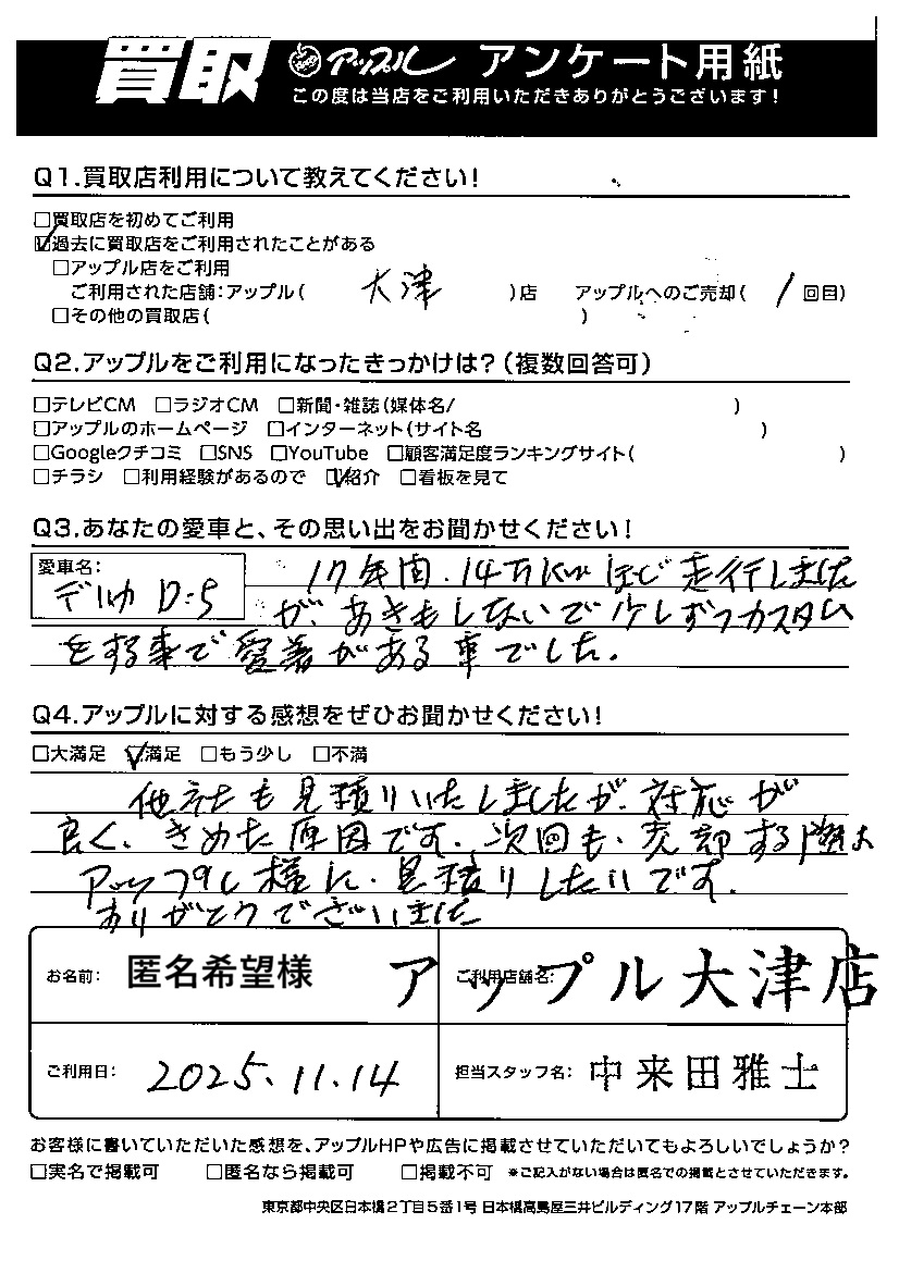 他社も見積もりいたしましたが、対応が良く、きめた原因です。次回も売却する際はアップル様に見積もりしたいです。