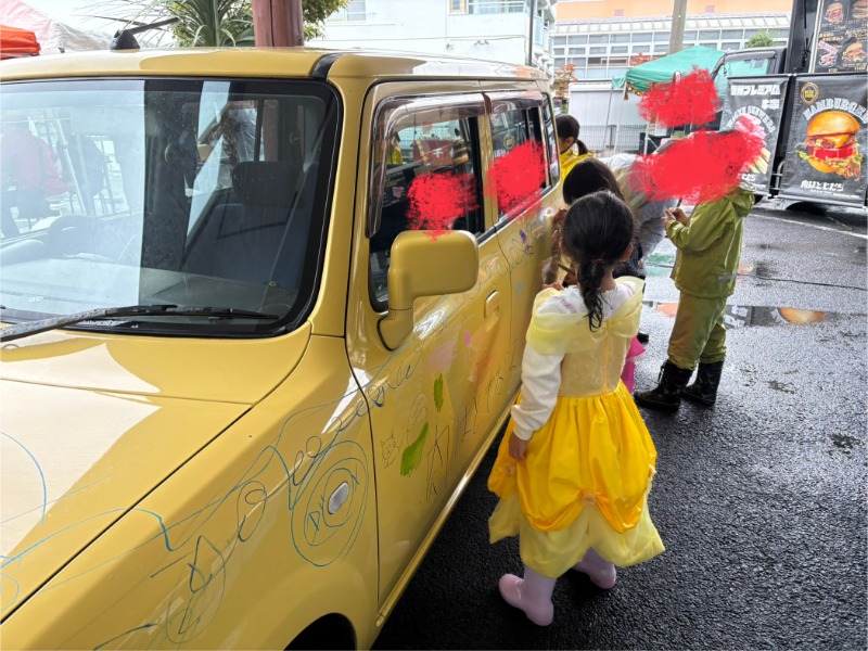なかなか車にお絵描きをする機会は滅多にないと、子供たちは大喜び。