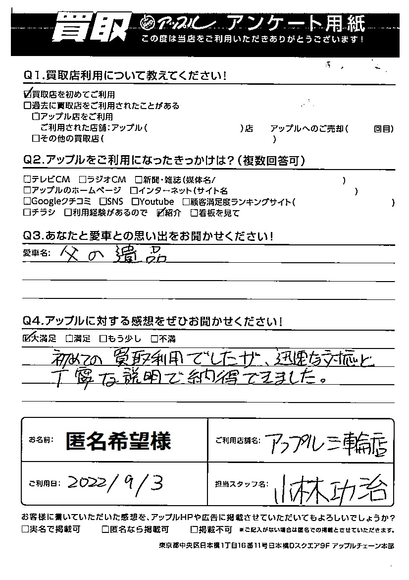 お車のご相談・ 査定だけでもOK! カンタン 入力 30秒 アップルがブランド買取始めました! お電話でも受付中! 受付時間10:00~19:00(日曜は18:00まで) 026-219-2415 お車のご相談・ 査定だけでもOK! カンタン 入力 30秒 アップルがブランド買取始めました! お電話でも受付中! 受付時間10:00~19:00(日曜は18:00まで) 026-219-2415 アップルがブランド買取始めました! お電話でも受付中! 受付時間10:00~19:00(日曜は18:00まで) 026-219-2415 店舗情報 在庫車 スタッフ紹介 ブログ お客様の声 キャンペーン 無料査定 click お客様の声 ご記入日: 2022/09/03 匿名希望様 Q あなたと愛車との思い出をお聞かせください!父の遺品Q アップルに対する感想をぜひお聞かせください!感想:大満足初めての買取利用でしたが、迅速な対応と丁寧な説明で納得できました。 前へ 次へ お客様の声一覧を見る