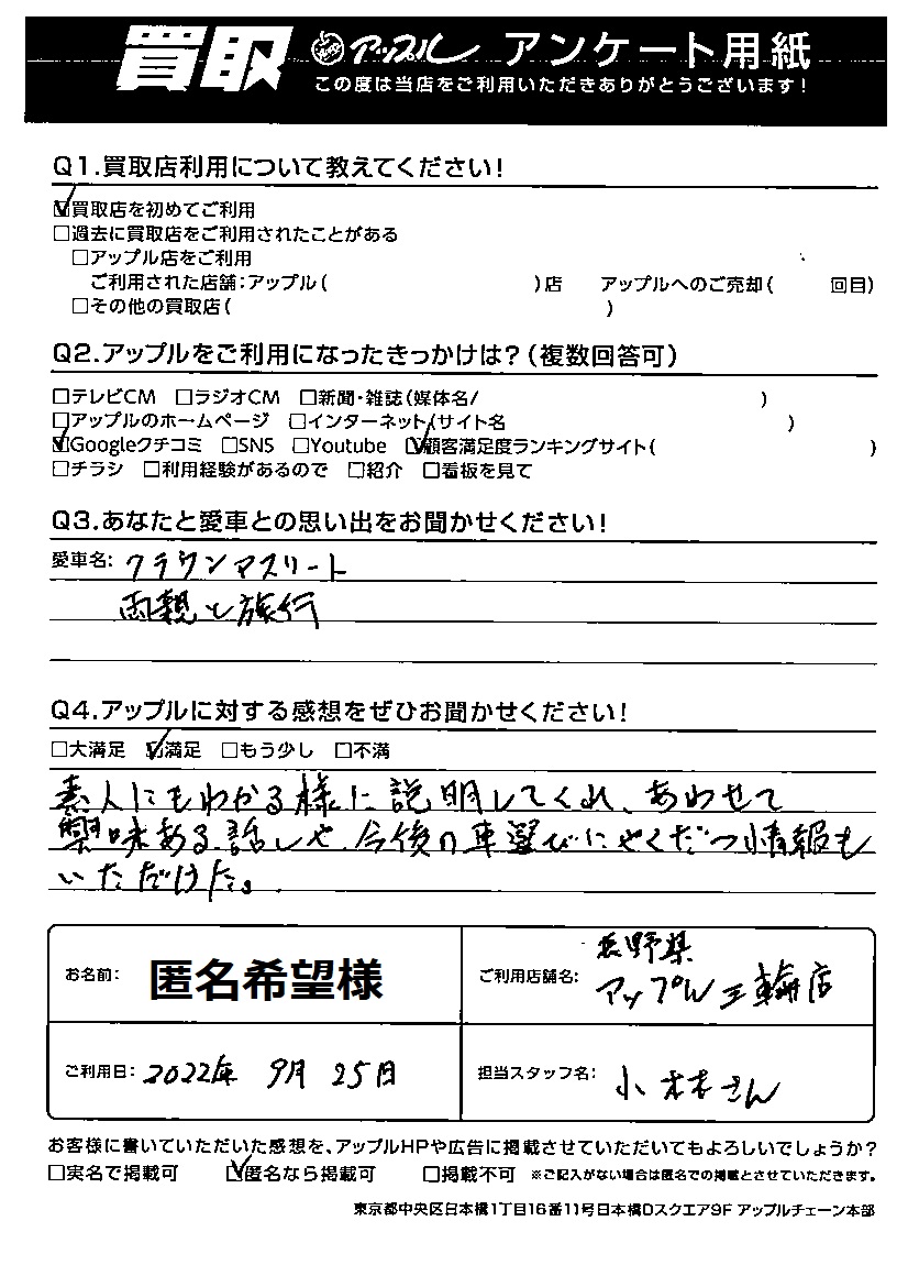 匿名希望様 車名:トヨタ クラウンアスリート (H11年9月~H30年6月)