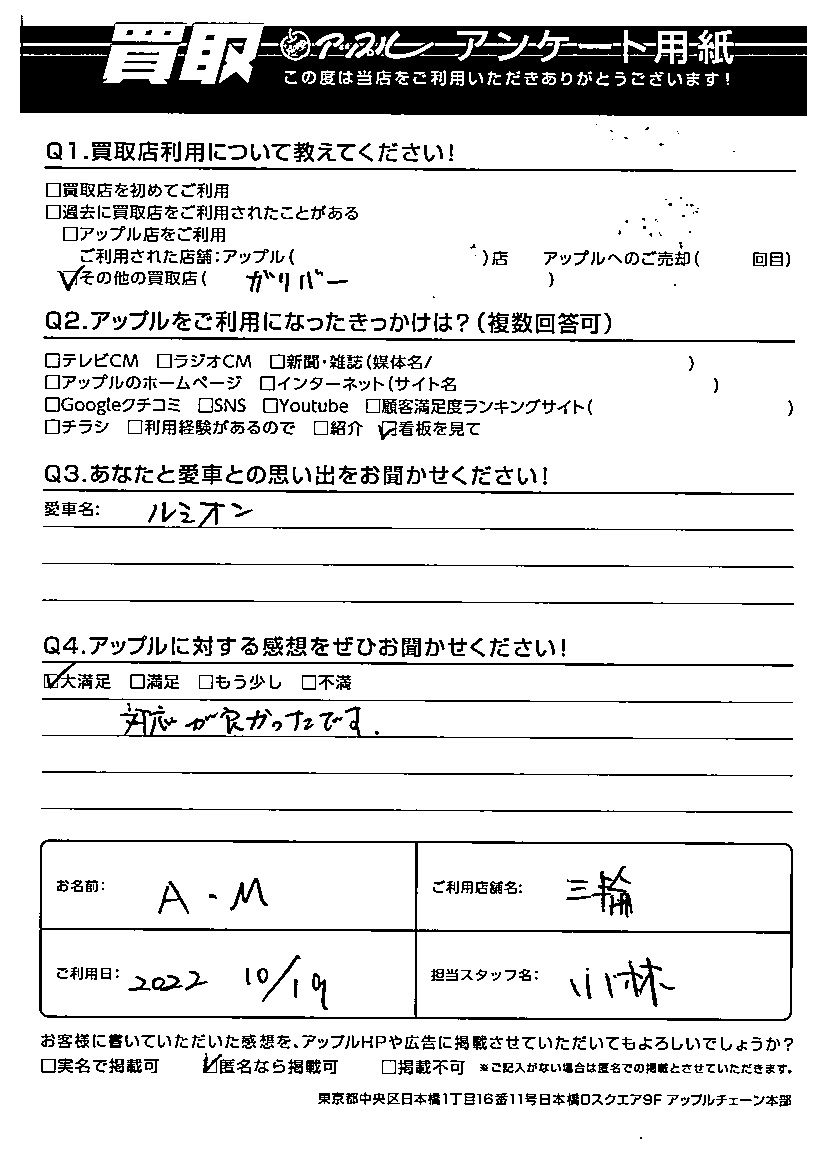 お車のご相談・ 査定だけでもOK! カンタン 入力 30秒 アップルがブランド買取始めました! お電話でも受付中! 受付時間10:00~19:00(日曜は18:00まで) 026-219-2415 お車のご相談・ 査定だけでもOK! カンタン 入力 30秒 アップルがブランド買取始めました! お電話でも受付中! 受付時間10:00~19:00(日曜は18:00まで) 026-219-2415 アップルがブランド買取始めました! お電話でも受付中! 受付時間10:00~19:00(日曜は18:00まで) 026-219-2415 店舗情報 在庫車 スタッフ紹介 ブログ お客様の声 キャンペーン 無料査定 click お客様の声 ご記入日: 2022/10/19 A・M様 車名:トヨタ カローラルミオン Q:アップルに対する感想をぜひお聞かせください!大満足対応が良かったです。 前へ 次へ お客様の声一覧を見る