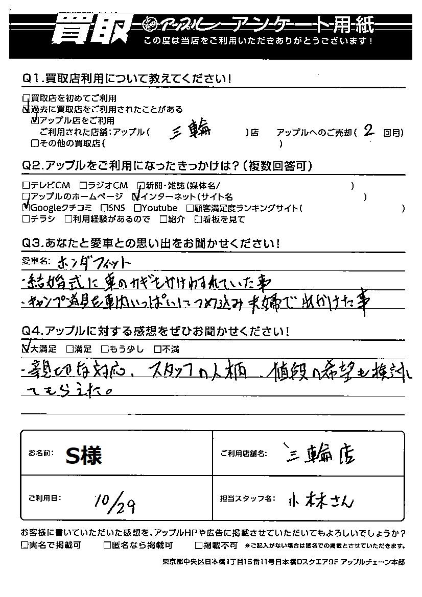 S様 車名:ホンダ フィット(H25年9月以降のハイブリッド含む)