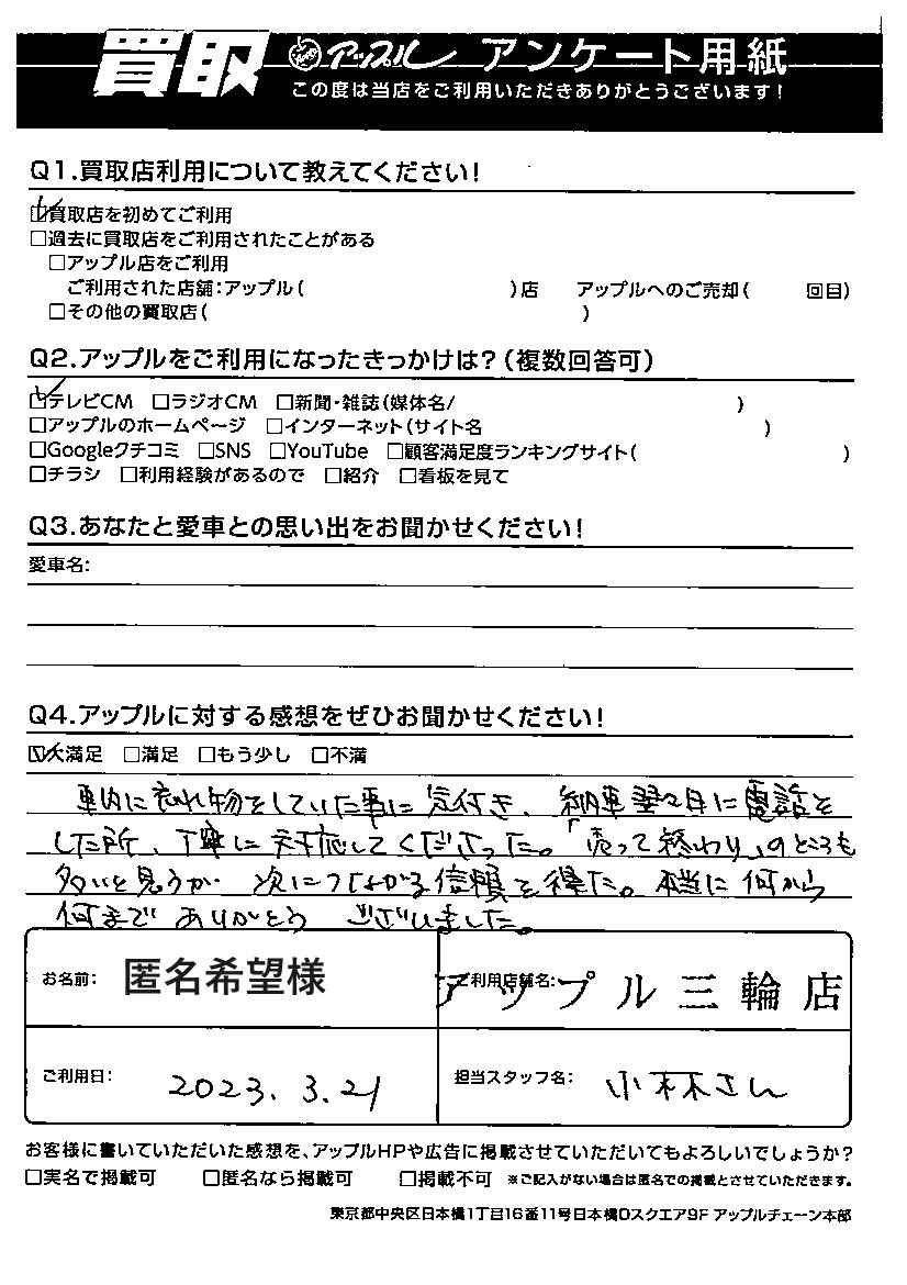 車内に忘れ物をしていた事に気付き、納車翌々日に電話をした所