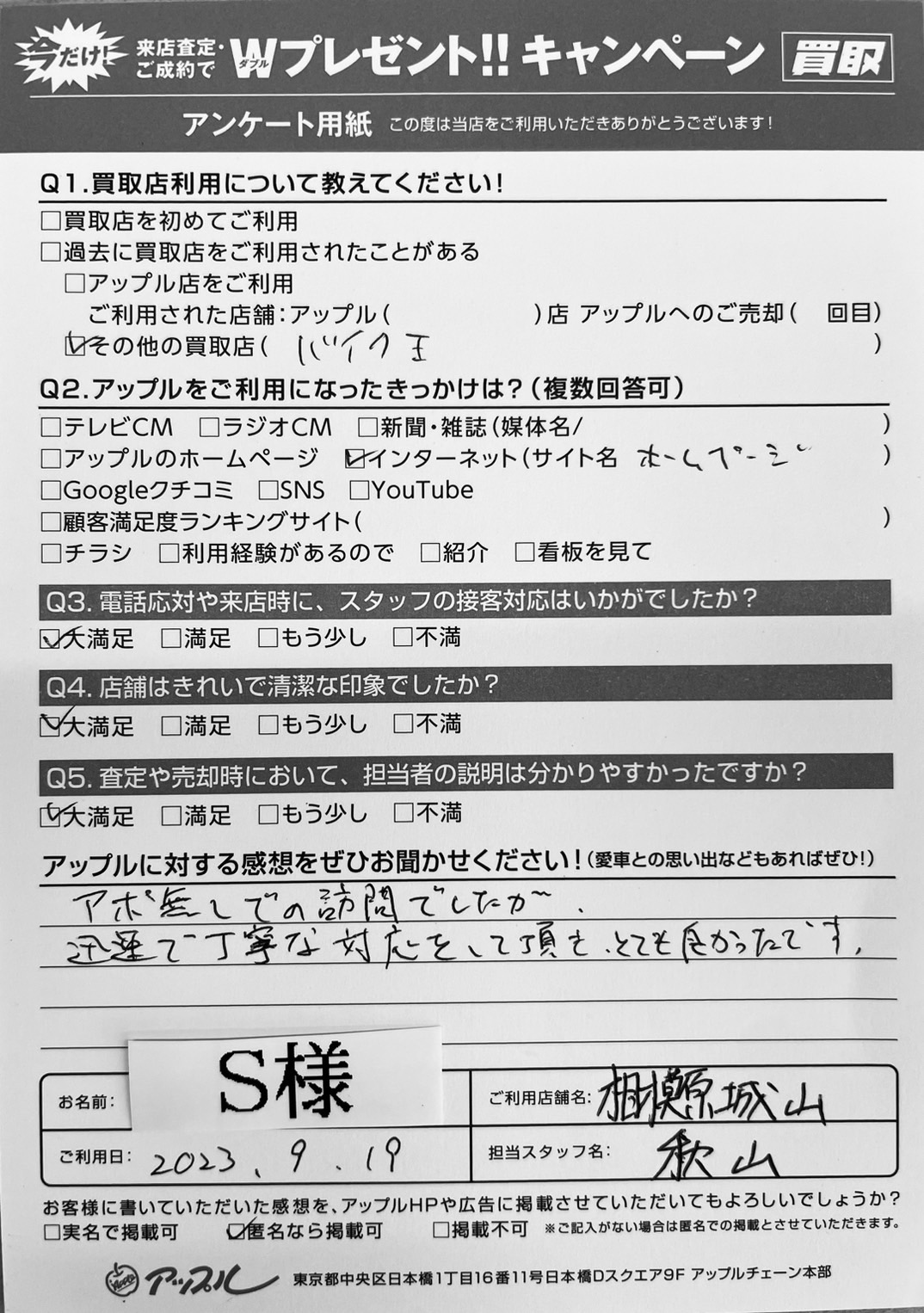 お車のご相談・ 査定だけでもOK! カンタン 入力 30秒 アップルがブランド買取始めました! お電話でも受付中! 受付時間10:00~18:00 0120-782-356 お車のご相談・ 査定だけでもOK! カンタン 入力 30秒 アップルがブランド買取始めました! お電話でも受付中! 受付時間10:00~18:00 0120-782-356 アップルがブランド買取始めました! お電話でも受付中! 受付時間10:00~18:00 0120-782-356 店舗情報 在庫車 スタッフ紹介 ブログ お客様の声 キャンペーン 無料査定 click お客様の声 ご記入日: 2023/10/03 S様 車名:スズキ ワゴンR ご利用日:2023/9/19 担当:秋山Q.アップルに対する感想をぜひお聞かせください!大満足アポ無しでの訪問でしたが、迅速で丁寧な対応をして頂き、とても良かったです。 前へ 次へ お客様の声一覧を見る