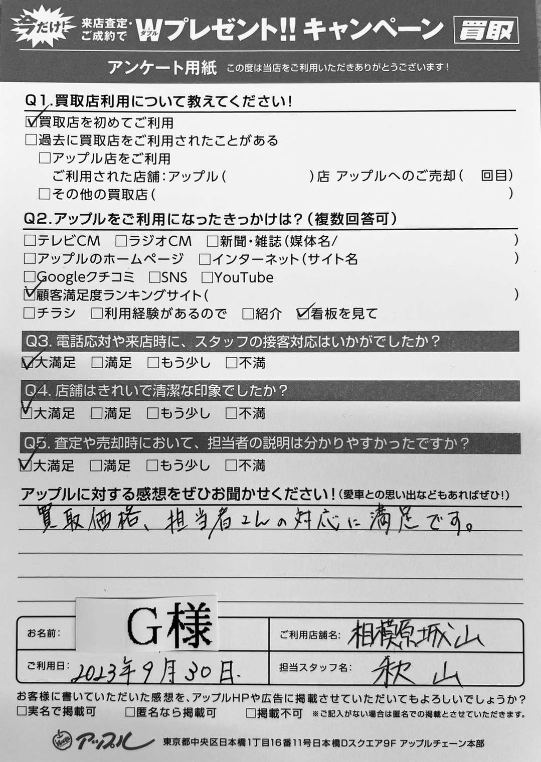 お車のご相談・ 査定だけでもOK! カンタン 入力 30秒 アップルがブランド買取始めました! お電話でも受付中! 受付時間10:00~18:00 0120-782-356 お車のご相談・ 査定だけでもOK! カンタン 入力 30秒 アップルがブランド買取始めました! お電話でも受付中! 受付時間10:00~18:00 0120-782-356 アップルがブランド買取始めました! お電話でも受付中! 受付時間10:00~18:00 0120-782-356 店舗情報 在庫車 スタッフ紹介 ブログ お客様の声 キャンペーン 無料査定 click お客様の声 ご記入日: 2023/10/10 G様 車名:トヨタ プリウスα ご利用日:2023/9/30 担当:秋山Q.アップルに対する感想をぜひお聞かせください!大満足買取価格、担当者さんの対応に満足です。 前へ 次へ お客様の声一覧を見る