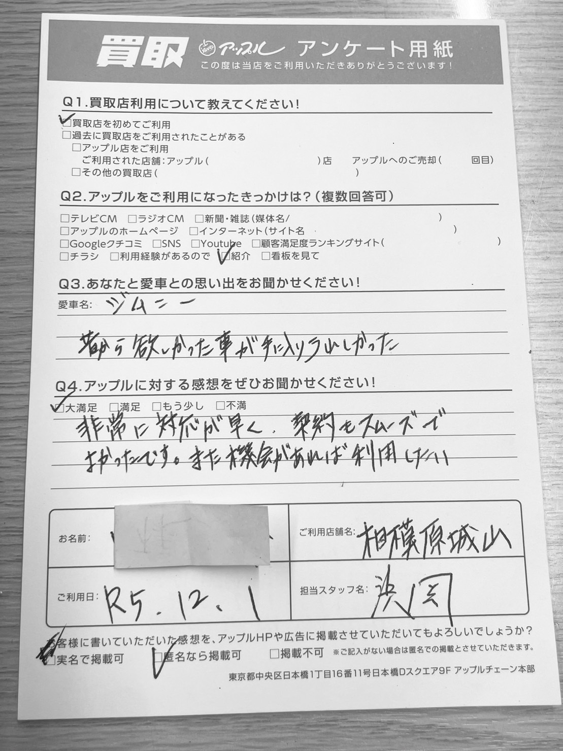相模原市城山 K様 車名:スズキ ジムニーシエラ