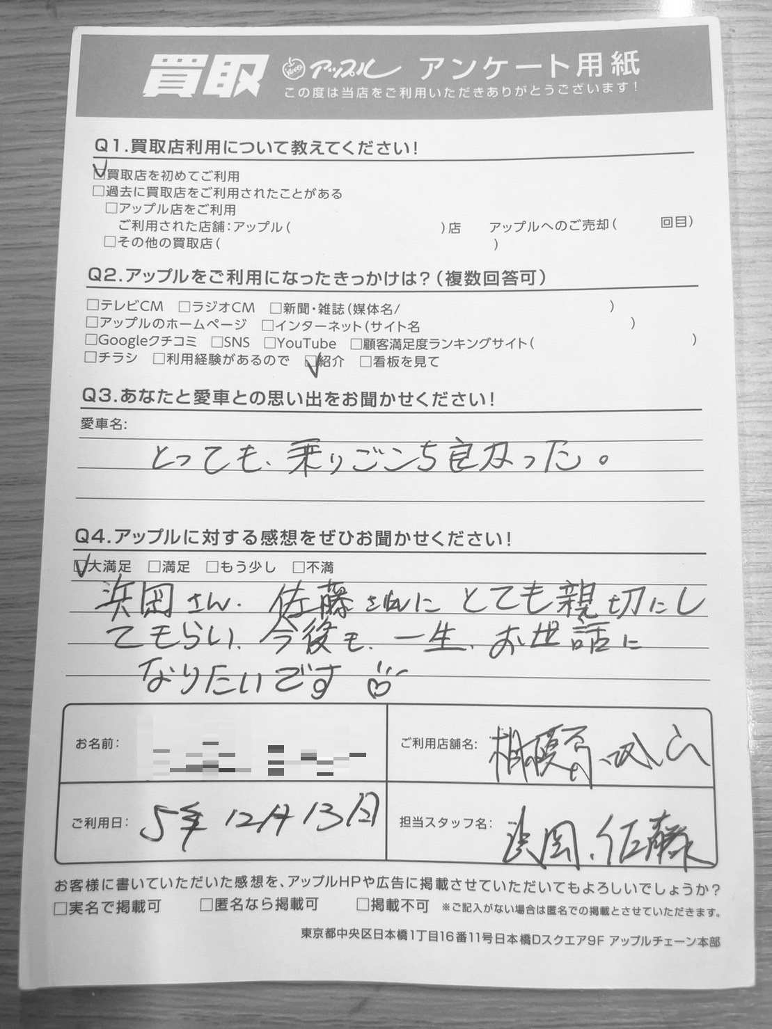 A.浜岡さん、佐藤さんにとても親切にしてもらい、今後も一生お世話になりたいです。