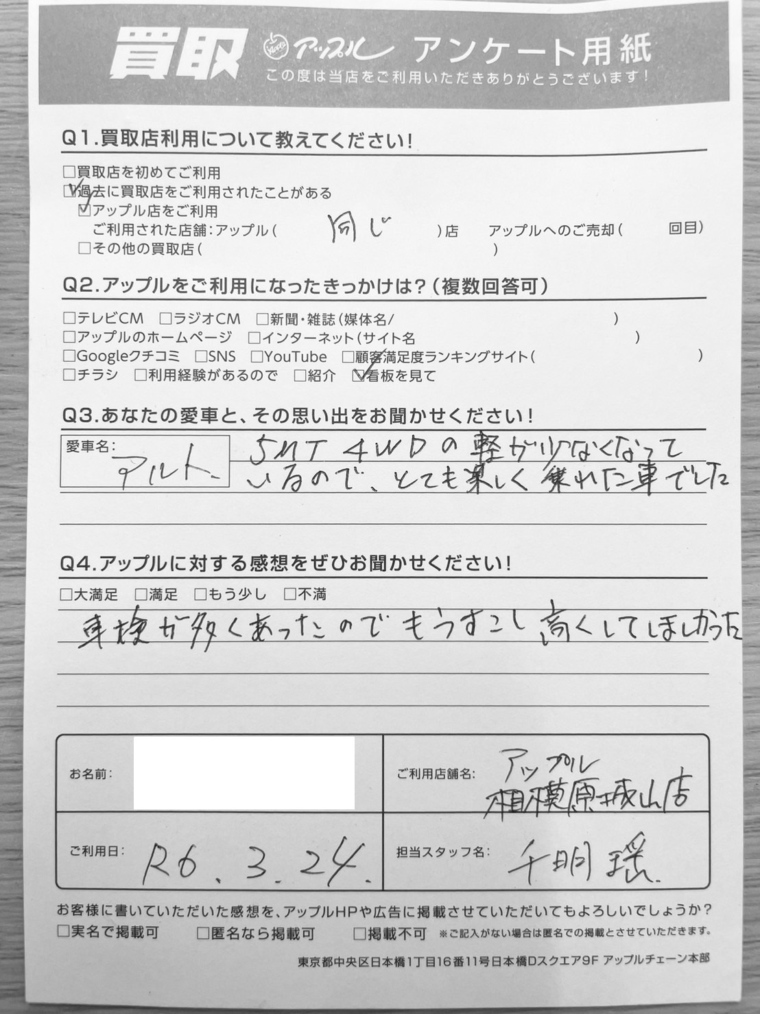 お車のご相談・ 査定だけでもOK! カンタン 入力 30秒 アップルがブランド買取始めました! お電話でも受付中! 受付時間10:00~18:00 0120-782-356 お車のご相談・ 査定だけでもOK! カンタン 入力 30秒 アップルがブランド買取始めました! お電話でも受付中! 受付時間10:00~18:00 0120-782-356 アップルがブランド買取始めました! お電話でも受付中! 受付時間10:00~18:00 0120-782-356 店舗情報 在庫車 スタッフ紹介 ブログ お客様の声 キャンペーン 無料査定 click お客様の声 ご記入日: 2024/03/24 東京都八王子市 S様 車名:スズキ アルト (2015年12月以降のワークス含む) Q3.あなたの愛車と、その思い出をお聞かせください!A.アルト 5MT4WDの軽が少なくなっているので、とても楽しく乗れた車でした。 前へ 次へ お客様の声一覧を見る