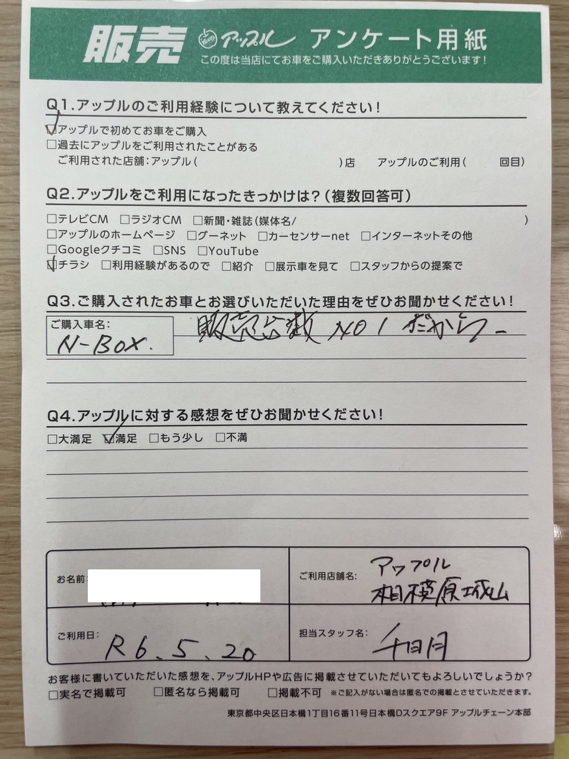 お車のご相談・ 査定だけでもOK! カンタン 入力 30秒 アップルがブランド買取始めました! お電話でも受付中! 受付時間10:00~18:00 0120-782-356 お車のご相談・ 査定だけでもOK! カンタン 入力 30秒 アップルがブランド買取始めました! お電話でも受付中! 受付時間10:00~18:00 0120-782-356 アップルがブランド買取始めました! お電話でも受付中! 受付時間10:00~18:00 0120-782-356 店舗情報 在庫車 スタッフ紹介 ブログ お客様の声 キャンペーン 無料査定 click お客様の声 ご記入日: 2024/05/20 神奈川県相模原市 S様 車名:ホンダ N-BOX Q3.ご購入されたお車とお選びいただいた理由をぜひお聞かせください!A.N-BOX 販売代位数NO1だから 前へ 次へ お客様の声一覧を見る
