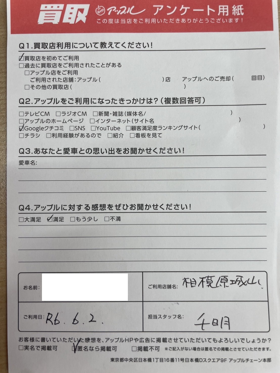 お車のご相談・ 査定だけでもOK! カンタン 入力 30秒 アップルがブランド買取始めました! お電話でも受付中! 受付時間10:00~18:00 0120-782-356 お車のご相談・ 査定だけでもOK! カンタン 入力 30秒 アップルがブランド買取始めました! お電話でも受付中! 受付時間10:00~18:00 0120-782-356 アップルがブランド買取始めました! お電話でも受付中! 受付時間10:00~18:00 0120-782-356 店舗情報 在庫車 スタッフ紹介 ブログ お客様の声 キャンペーン 無料査定 click お客様の声 ご記入日: 2024/06/02 神奈川県相模原市 F様 車名:スズキ アルト (2015年12月以降のワークス含む) 前へ 次へ お客様の声一覧を見る