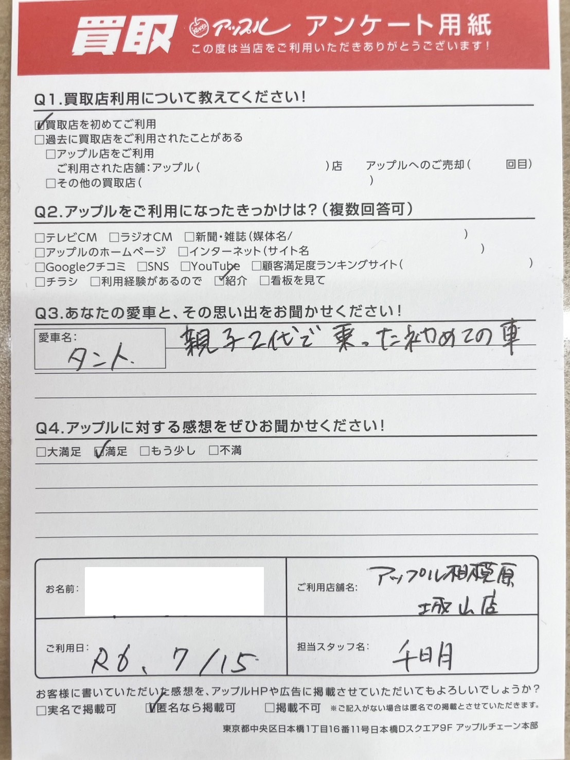 お車のご相談・ 査定だけでもOK! カンタン 入力 30秒 アップルがブランド買取始めました! お電話でも受付中! 受付時間10:00~18:00 0120-782-356 お車のご相談・ 査定だけでもOK! カンタン 入力 30秒 アップルがブランド買取始めました! お電話でも受付中! 受付時間10:00~18:00 0120-782-356 アップルがブランド買取始めました! お電話でも受付中! 受付時間10:00~18:00 0120-782-356 店舗情報 在庫車 スタッフ紹介 ブログ お客様の声 キャンペーン 無料査定 click お客様の声 ご記入日: 2024/07/15 神奈川県相模原市緑区二本松 Y様 車名:ダイハツ タント Q3.あなたの愛車と、その思い出をお聞かせください!A. タント 親子二代で乗った初めての車 前へ 次へ お客様の声一覧を見る