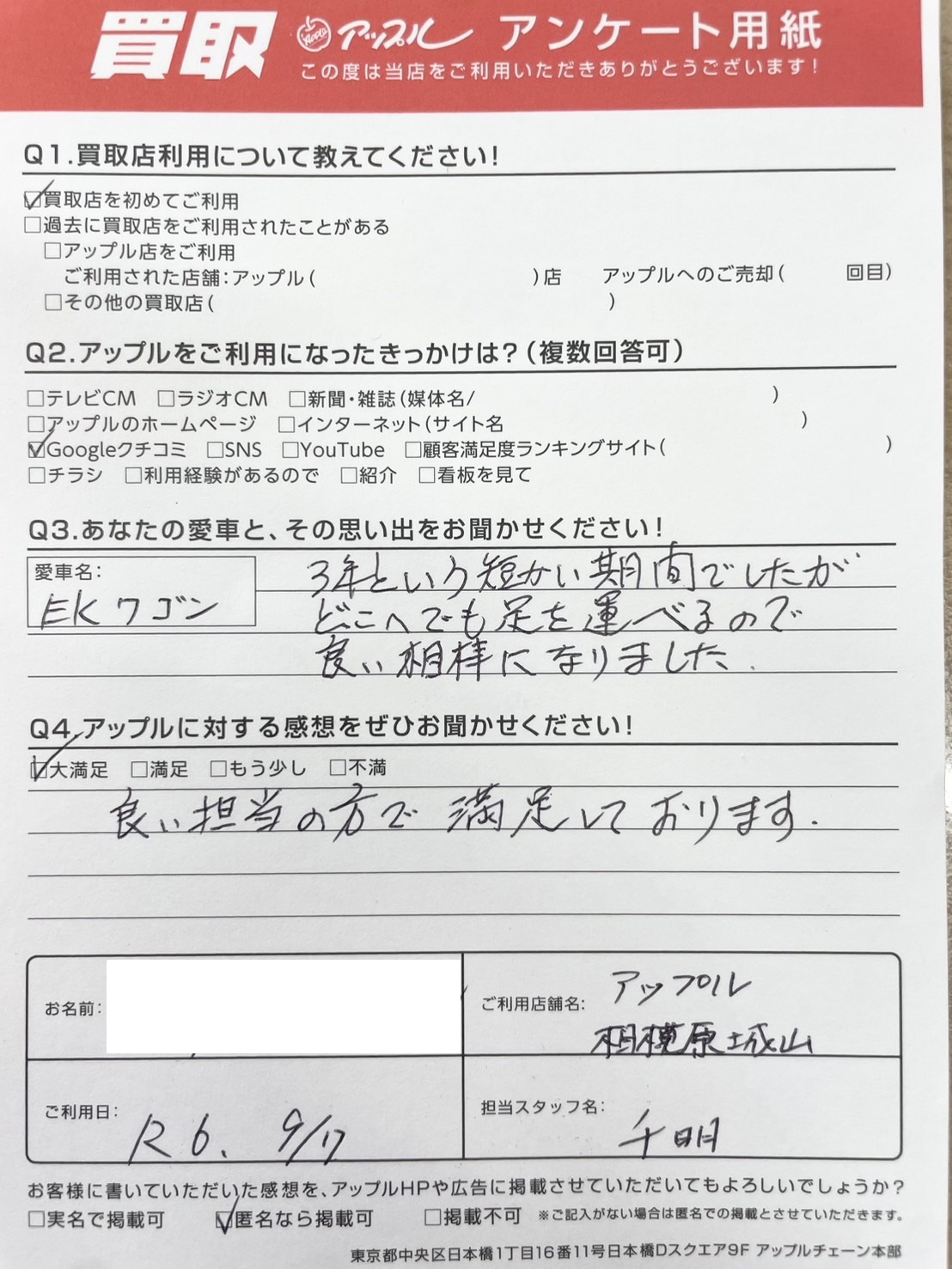 神奈川相模原市中央区田名 Y様 車名:三菱 eKワゴン