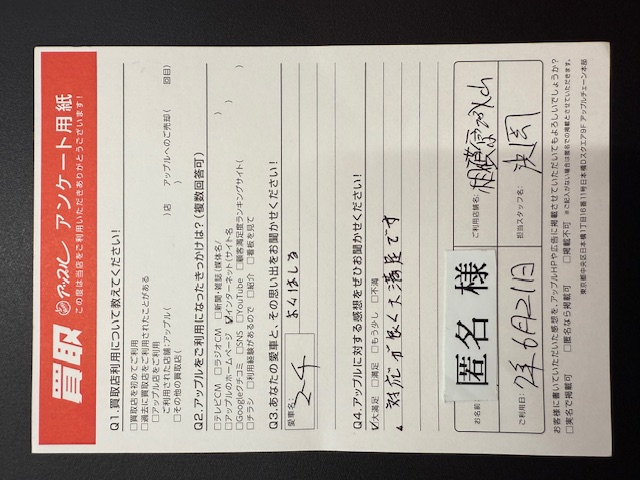 お車のご相談・ 査定だけでもOK! カンタン 入力 30秒 アップルがブランド買取始めました! お電話でも受付中! 受付時間10:00~18:00 0120-782-356 お車のご相談・ 査定だけでもOK! カンタン 入力 30秒 アップルがブランド買取始めました! お電話でも受付中! 受付時間10:00~18:00 0120-782-356 アップルがブランド買取始めました! お電話でも受付中! 受付時間10:00~18:00 0120-782-356 店舗情報 在庫車 スタッフ紹介 ブログ お客様の声 キャンペーン 無料査定 click お客様の声 ご記入日: 2025/06/21 I様 車名:日産 マーチ Q3.あなたの愛車と、その思い出をお聞かせください!よく走る。Q4.アップルに対する感想を是非お聞かせください!対応が良く大満足です。 前へ 次へ お客様の声一覧を見る