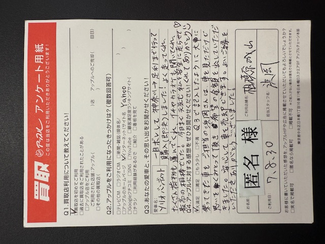 Q3で記入したように大事に乗ってきた車を、ご担当の浜岡さんは車を見ただけで思いをくみ取って頂き希望の金額を出していただきました。安心して車を売却できます。よいご縁を頂きありがとうございました!