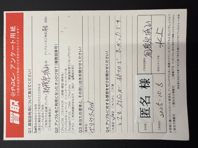 お車のご相談・ 査定だけでもOK! カンタン 入力 30秒 アップルがブランド買取始めました! お電話でも受付中! 受付時間10:00~18:00 0120-782-356 お車のご相談・ 査定だけでもOK! カンタン 入力 30秒 アップルがブランド買取始めました! お電話でも受付中! 受付時間10:00~18:00 0120-782-356 アップルがブランド買取始めました! お電話でも受付中! 受付時間10:00~18:00 0120-782-356 店舗情報 在庫車 スタッフ紹介 ブログ お客様の声 キャンペーン 無料査定 click お客様の声 ご記入日: 2025/10/05 S様 車名:トヨタ プリウスPHV(2023年3月~のPHV含まず) Q4.アップルに対する感想を是非お聞かせください!とても対応が親切でよかったです。 前へ 次へ お客様の声一覧を見る