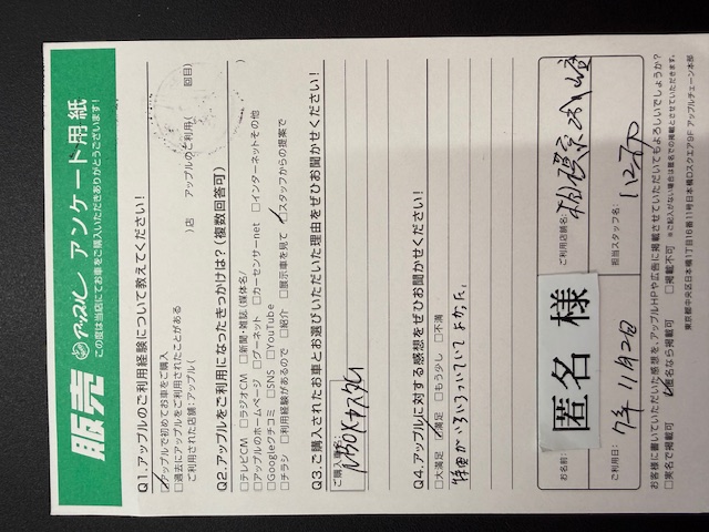 お車のご相談・ 査定だけでもOK! カンタン 入力 30秒 アップルがブランド買取始めました! お電話でも受付中! 受付時間10:00~18:00 0120-782-356 お車のご相談・ 査定だけでもOK! カンタン 入力 30秒 アップルがブランド買取始めました! お電話でも受付中! 受付時間10:00~18:00 0120-782-356 アップルがブランド買取始めました! お電話でも受付中! 受付時間10:00~18:00 0120-782-356 店舗情報 在庫車 スタッフ紹介 ブログ お客様の声 キャンペーン 無料査定 click お客様の声 ご記入日: 2025/11/02 M様 車名:ホンダ N-BOX Q4.アップルに対する感想を是非お聞かせください!特典がいろいろついていてよかった。 前へ 次へ お客様の声一覧を見る