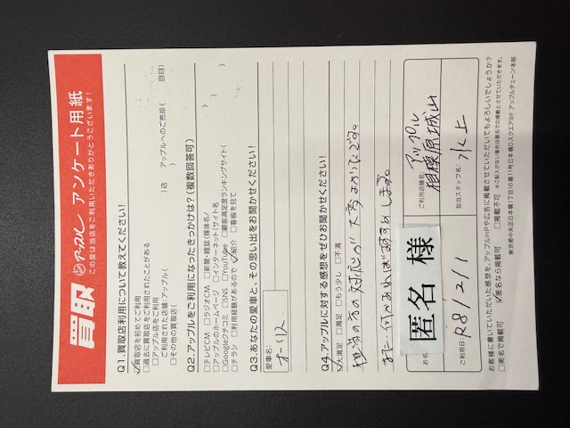 お車のご相談・ 査定だけでもOK! カンタン 入力 30秒 アップルがブランド買取始めました! お電話でも受付中! 受付時間10:00~18:00 0120-782-356 お車のご相談・ 査定だけでもOK! カンタン 入力 30秒 アップルがブランド買取始めました! お電話でも受付中! 受付時間10:00~18:00 0120-782-356 アップルがブランド買取始めました! お電話でも受付中! 受付時間10:00~18:00 0120-782-356 店舗情報 在庫車 スタッフ紹介 ブログ お客様の声 キャンペーン 無料査定 click お客様の声 ご記入日: 2026/02/01 H様 車名:トヨタ オーリス Q4.アップルに対する感想を是非お聞かせください!担当の方の対応が大変良かったです。また何かあればお勧めします。 前へ 次へ お客様の声一覧を見る