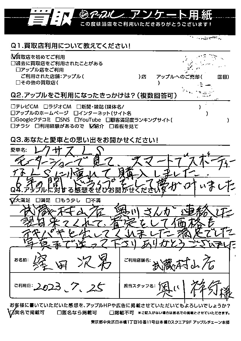 窪田 次男様 車名:レクサス LS (国内仕様 右H H29年10月~HYBRID含)