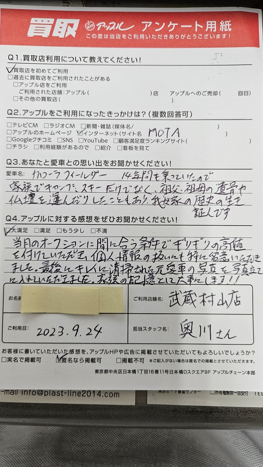 ご利用日:2023年9月24日 担当者:奥川