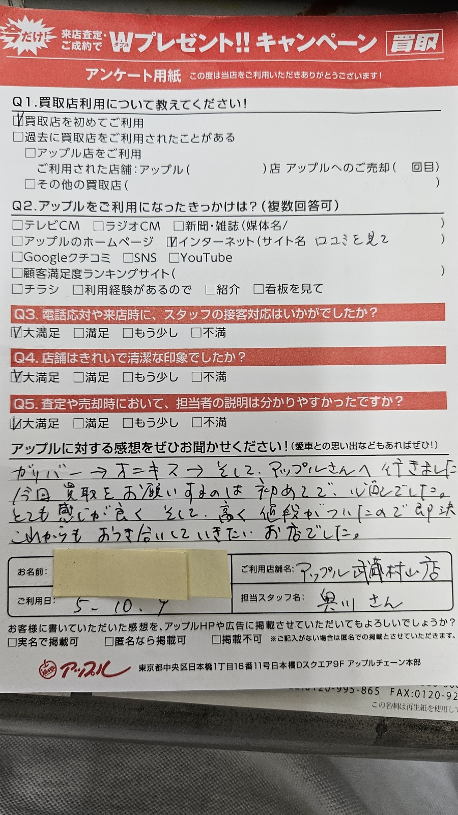 ご利用日:2023年10月9日 担当者:奥川