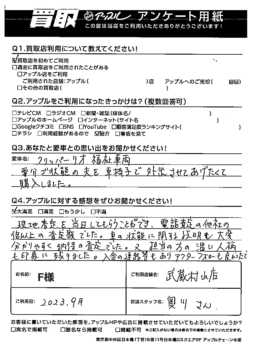 車の状態に関する説明も大変分かりやすく納得の査定でした。