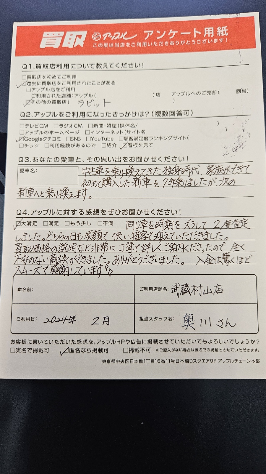 同じ車を時期をズラして2度査定しました。どちらの日も笑顔で快い接客で迎えていただきました。