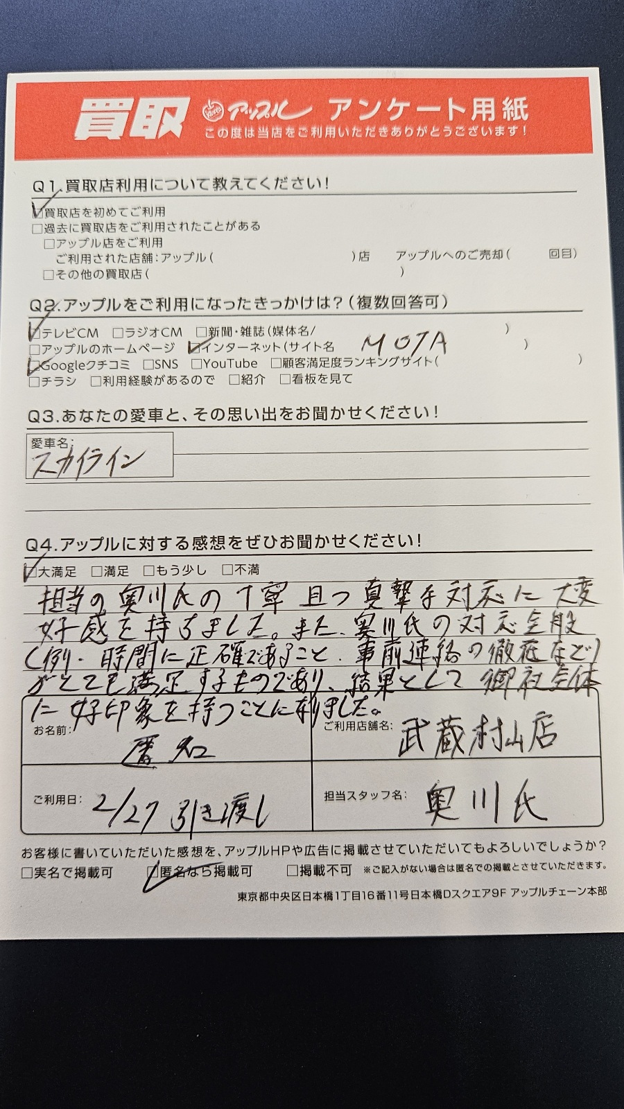 ご利用日:2024年2月27日 担当者:奥川
