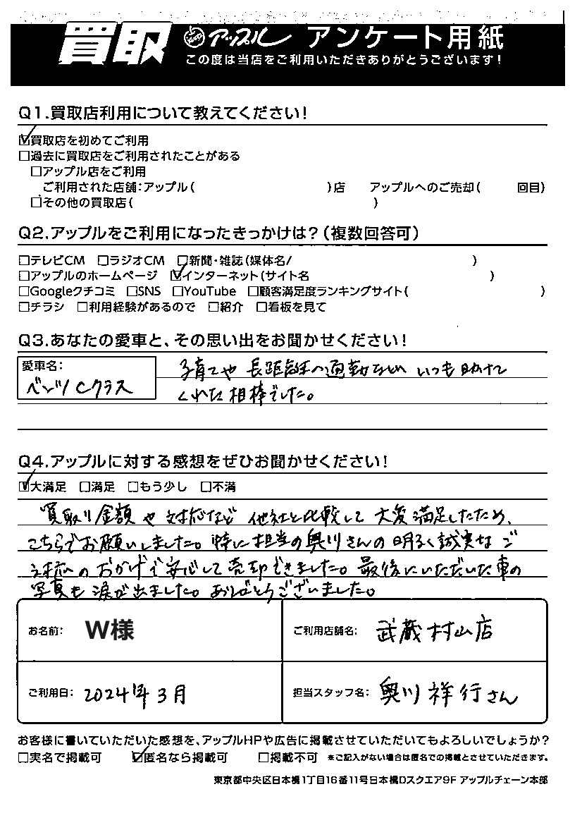 W様 車名:メルセデス・ベンツ Cクラス