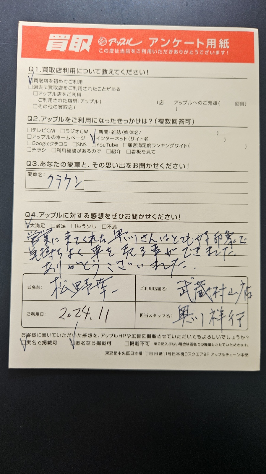 ご利用日:2024年11月24日 担当者名:奥川