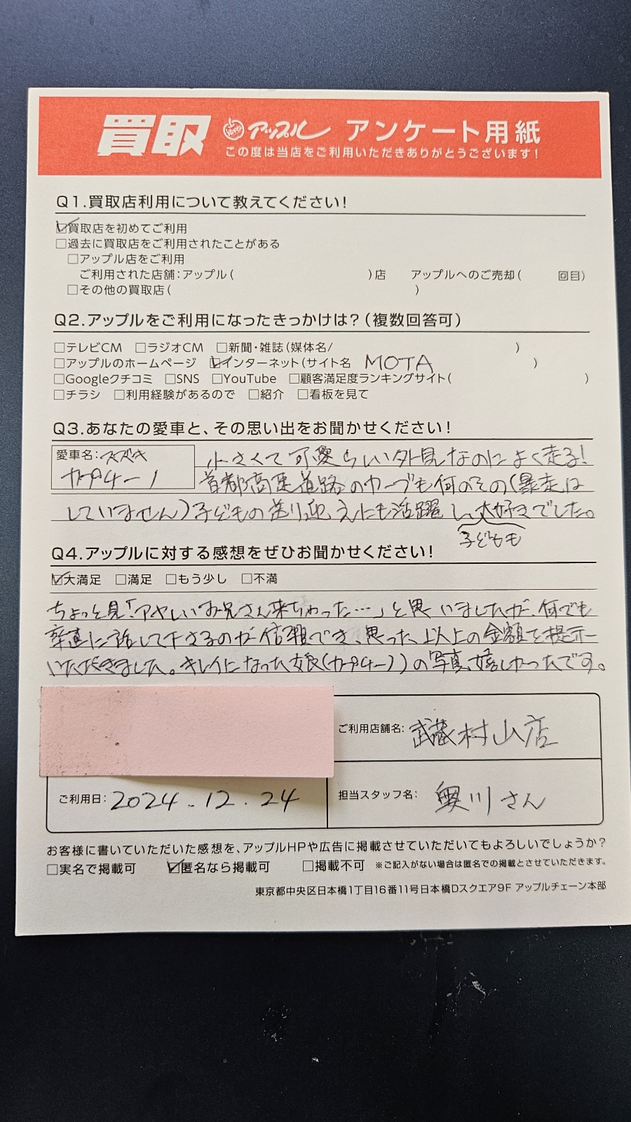 ご利用日:2024年12月24日 担当者名:奥川