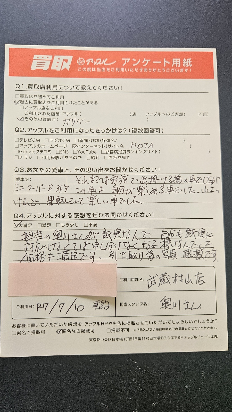 担当の奥川さんが誠実な人で、自分も誠実に対応しなくては申し訳なくなる様な人でした。